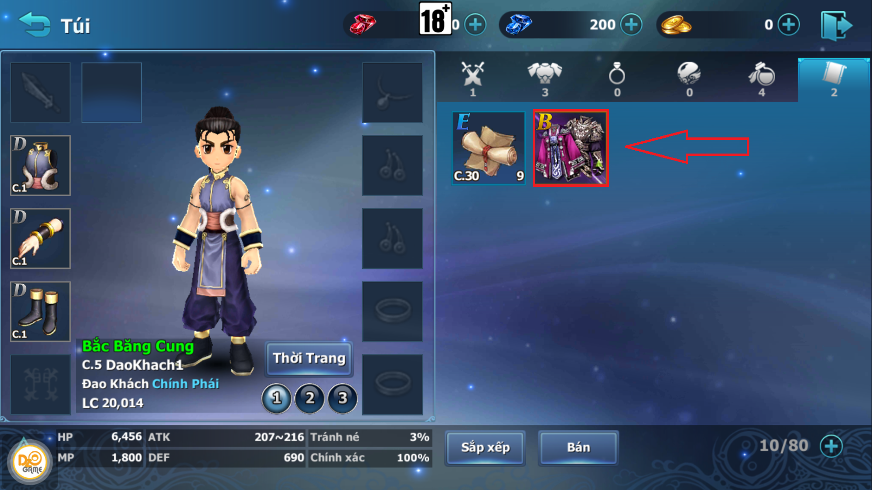 - Bước 2: Bấm chọn mục Túi >> sẽ được đưa tới vị trí chứa thời trang Hiệp Khách trong túi đồ.