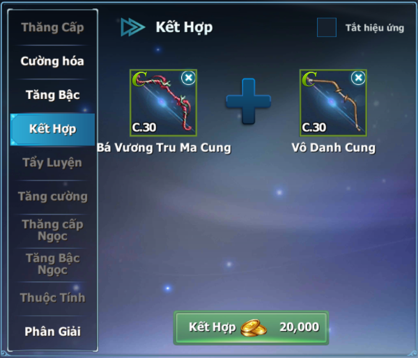 Ví dụ: sử dụng 2 vũ khí cấp C là Bá Vương Tru Ma Cung và Vô Danh Cung đã đạt cấp độ tối đa để Kết Hợp.