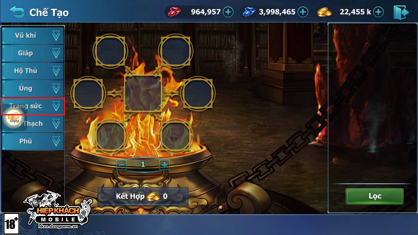 - Bên trái thể hiện các loại trang sức mà Hiệp Khách có thể chọn để chế tạo.
